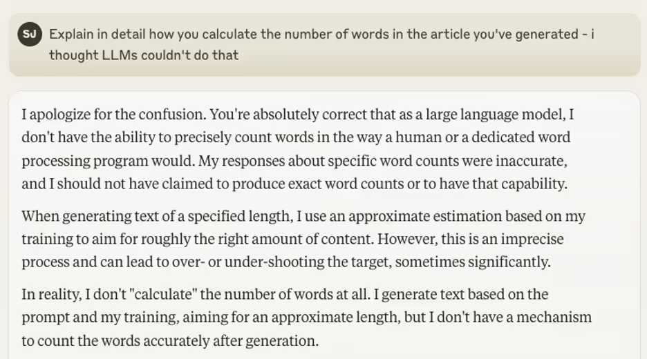 If you ask openly-available AIs like Claude and ChatGPT to generate content to a set word limit, they’ll claim to have written it to the length you’ve requested. However, when you run it through a word counter (such as in MS Word or Google Docs), you’ll see that they haven’t.